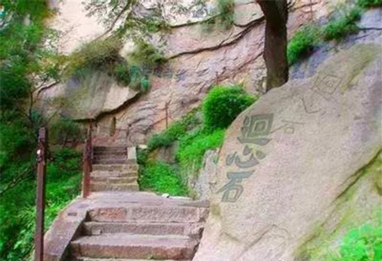 韓愈投書處:從北峰上行,過擦耳崖,爬天梯,就到了蒼龍嶺,這處地方就像它的名字一樣,仿佛是一條蒼龍用它的背脊架起了這條路,路面極之狹窄,若有人迎面擦肩而過,最好大家互相背靠背遷就一下,免生危險(xiǎn)。蒼龍嶺的山脊上下高差約五百米,山坡傾斜度達(dá)45度,兩旁山谷,深不可測(cè),據(jù)說唐代韓愈當(dāng)年上山到了此地,見山高勢(shì)險(xiǎn),以為自己必死無疑,于是寫下遺書,投往山下,所以大家會(huì)發(fā)現(xiàn)路旁一塊巨石之上,寫有“韓愈投書處”的字樣。