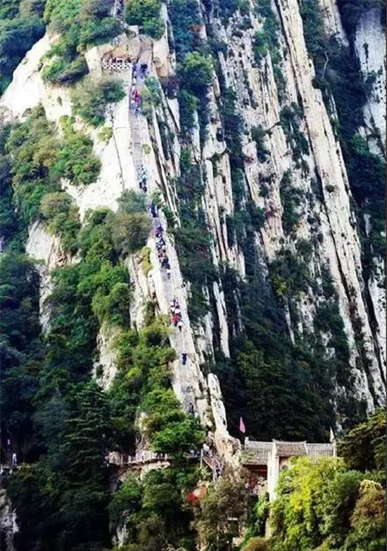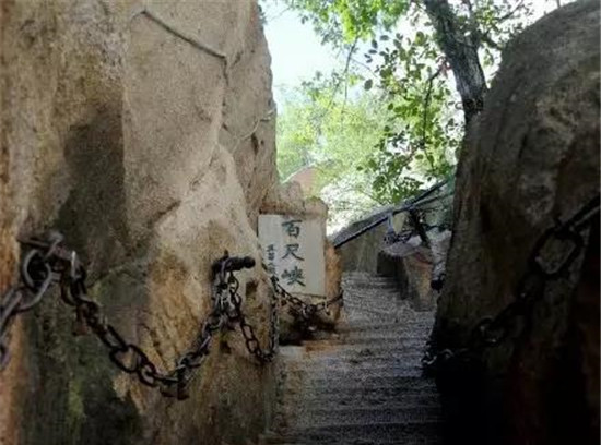 千尺幢:一條陡峭的鳥道從懸崖穿過,僅能容兩人上下,坡度成一條垂直的線,372個(gè)臺(tái)階向天而上,就像一頭瘦骨嶙峋的老牛的肋骨,承載了數(shù)不清游人沉重的腳步。弓著身子努力向上攀爬的時(shí)候,雙手使勁拉住了旁邊的鐵鏈,嘩啦嘩啦的聲音始終在千尺幢這里回響著,除去鐵鏈的聲響,這條鳥道充滿的是小心翼翼的安靜,偶爾有人喊一聲,也是脫口而出的叮嚀和提醒。
