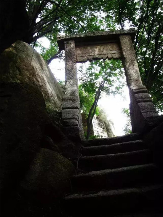 北斗坪上蒼松參天,青竹挺翠,初入有石卷門,稱總天一門。舊時門前石牌樓有鐵獅一對,分立兩側(cè),獅高數(shù)尺,生動逼真,今移至東道院。過門行數(shù)步,可見兩山環(huán)抱,風(fēng)景宜人,一石坊,額書“紫宸駐蹕”,意為這里是紫微星官居住的地方。