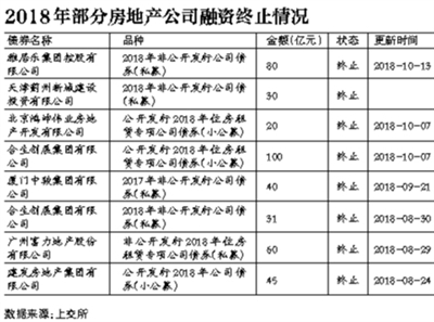 2018年10月份以來,已經(jīng)有多起涉房融資計劃中止/終止。上交所信息顯示,截至10月25日,已經(jīng)至少有8筆涉房融資計劃中止或終止審查。諸如,雅居樂擬發(fā)行的80億元非公開發(fā)行公司債券“終止”,該筆公司債曾于今年7月“中止”發(fā)行。合生創(chuàng)展100億規(guī)模的租賃住宅專項(xiàng)公司債券、天津薊州新城建設(shè)投資有限公司30億元的非公開發(fā)行公司債券、北京鴻坤偉業(yè)房地產(chǎn)開發(fā)有限公司20億元的住房租賃專項(xiàng)公司債券“終止”審查。10月份顯示“中止”融資計劃的有:中山招商-時代地產(chǎn)購房尾款資產(chǎn)支持專項(xiàng)計劃,擬發(fā)行金額14.3億元;奧園集團(tuán)有限公司非公開發(fā)行2018年住房租賃專項(xiàng)公司債,擬發(fā)行金額10億元,等等。