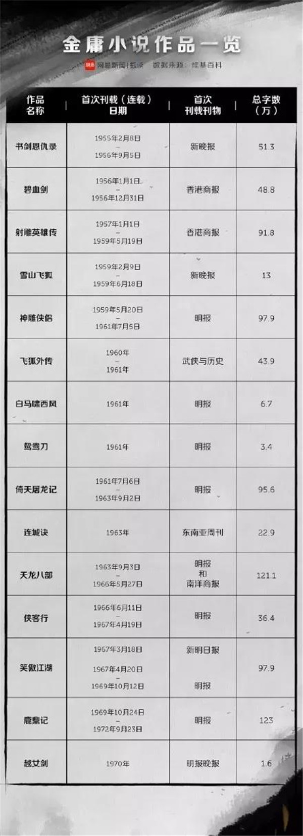 金庸先生曾在17年間里,寫了14部中、長篇武俠小說。每部小說取首字變成了: