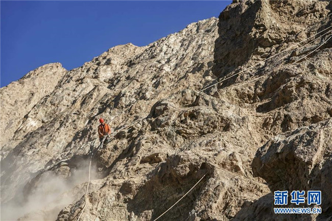 11月12日,在新疆塔什庫(kù)爾干塔吉克自治縣縣城至大同鄉(xiāng)道路的一處施工現(xiàn)場(chǎng),工人劉全在峭壁上作業(yè)。 近日,一支由四川、云南等地工人組成的施工隊(duì)忙碌在帕米爾高原深處的大山中,為塔什庫(kù)爾干塔吉克自治縣縣城至大同鄉(xiāng)道路的易落石路段安裝防護(hù)網(wǎng)。崇山峻嶺間,工人要攀爬至峭壁上施工作業(yè),如躍動(dòng)在大山間的“舞者”。據(jù)介紹,這支施工隊(duì)常年活躍在新疆山區(qū)道路的施工現(xiàn)場(chǎng),為風(fēng)險(xiǎn)路段加裝安全防護(hù)裝置,保障過(guò)往車輛和沿途村民出行安全。 新華社記者 胡虎虎 攝