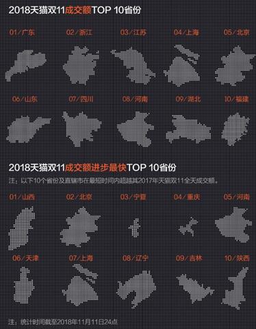 不過,今年最亮眼的地域榜單來自“進(jìn)步”飛快的10個(gè)大省——它們以最快的速度實(shí)現(xiàn)了對2017年全天成交額的超越。除了北京、重慶、上海和河南,山西、寧夏、河南、天津、遼寧、吉林、陜西都屬于名副其實(shí)的“剁手新生代”。