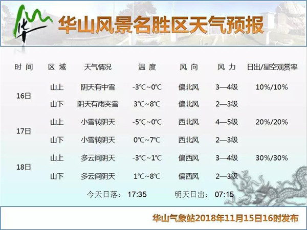 據(jù)天氣預(yù)報(bào)顯示,華山今、明兩日會(huì)有降雪天氣: