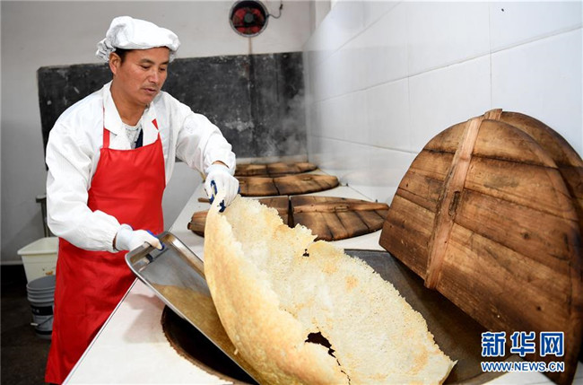 11月22日,汪明祥在鍋巴廠里加工鍋巴。 新華社記者 劉軍喜攝