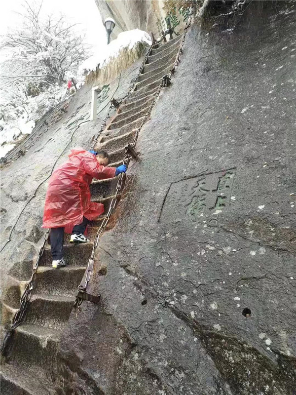 大概到了千尺幢,路就非常陡峭了,幾乎垂直攀登。戴上手套,登山杖收進(jìn)背包,抓緊鐵鏈子,懸崖外寒風(fēng)呼嘯,雨雪交加,絕壁上的古松巍然屹立,驢友相互鼓勵(lì)有說有笑,天冷,但心是熱的。