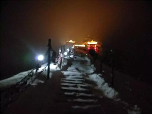 一直往上走,天色漸漸暗下來。和路上遇到的兩位山友告別后,我一個(gè)人繼續(xù)走,路面都是積雪,有的還結(jié)冰了,只好綁上冰爪,打開手電,偶爾抬頭看看被白雪浸染的山林。忽然,前面山頂上一片燈火輝煌,不知道那是不是天上的宮闕?