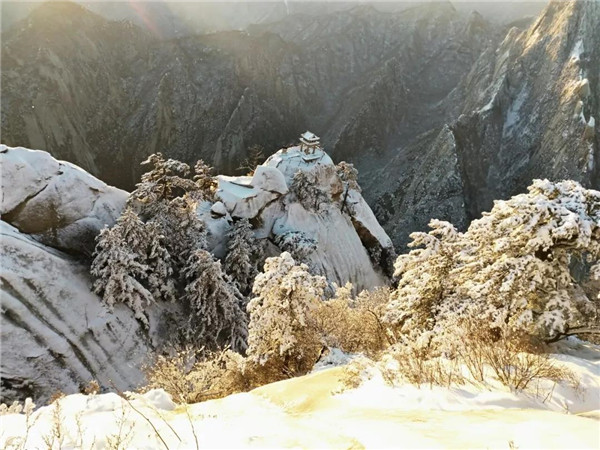 過后,又看到了下棋亭,長空棧道,華山松,西峰,南峰。想到金庸先生,想到“華山論劍”,“飛雪連天射白鹿,笑書神俠倚碧鴛”,伴隨了中國幾代人的武俠情懷。這里,金色的陽光,湛藍(lán)的天空,皚皚白雪;站在南峰仰天池上,左手秦嶺群山,右手八百里秦川,這就是華山之巔!