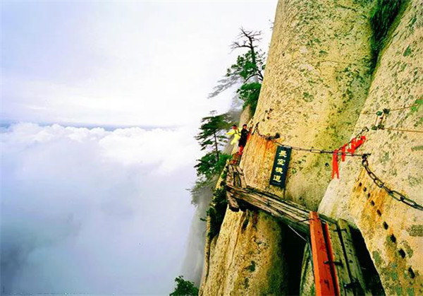 長空棧道位于南天門外,是華山著名險道之首。棧道分三段:南天門石坊至朝元洞西,路依崖鑿出,長20米,寬二尺許,為上段。折而下,崖隙橫貫鐵棍,形如凌空懸梯,游人須挽索逐級而下,稱之“雞下架”,是為中段。再西折為下段,筑路者在峭壁上鑿出石孔,楔進石樁,石樁之間架木椽三根,游人至此,須面壁貼腹,腳踏木椽橫向移動前行。
