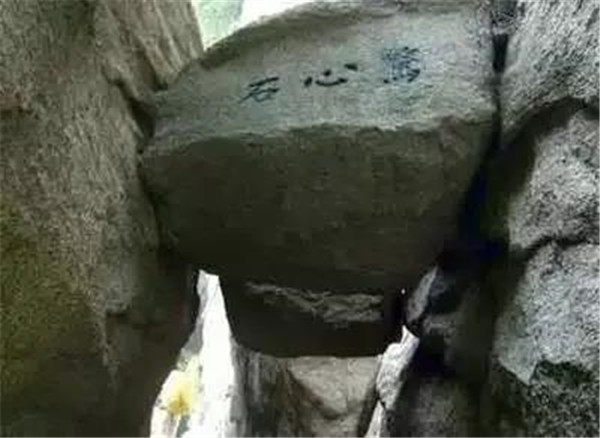 出千尺幢并不遠,便是百尺峽,這里是登山的第二道險關(guān),兩壁高聳,中夾有一塊崩落下來的巨石,人從石下過,驚心動魄,抬頭望去,石上題有“驚心石”三個大字。