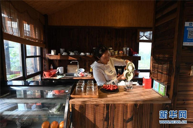 工作人員在無(wú)錫宜興白塔村內(nèi)的一間茶室招待游客(2018年4月2日攝)。 新華社記者 季春鵬 攝