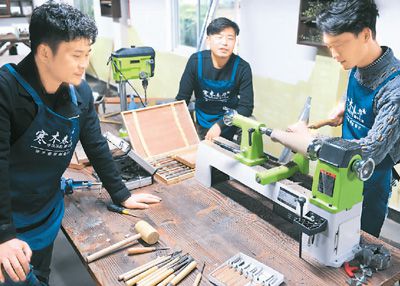 回鄉(xiāng)創(chuàng)業(yè)正成為大學生就業(yè)的重要方向。上圖為浙江省湖州市安吉縣統(tǒng)里村,3名大學畢業(yè)生在工作坊內加工花器。張禮慶攝(新華社發(fā))