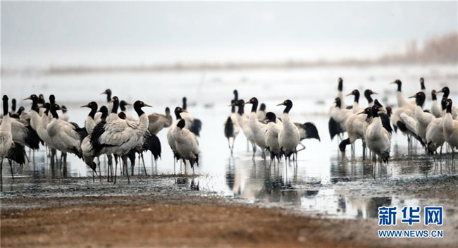 2月21日在草海國家級自然保護(hù)區(qū)內(nèi)拍攝的黑頸鶴。新華社發(fā)(何歡攝)