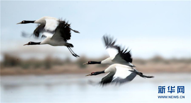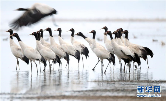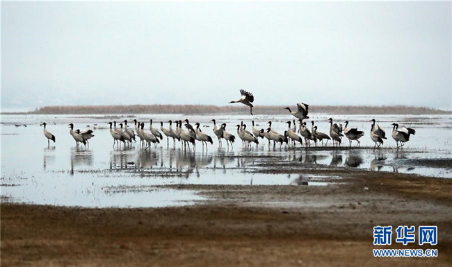 草海保護(hù)區(qū)是黑頸鶴越冬的主要棲息地之一,其在草海越冬期約為每年10月下旬到次年3月底。黑頸鶴是全球唯一在高原生長、繁殖的鶴類。新華社記者楊楹攝