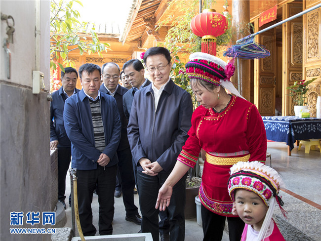 這是2月25日,韓正在大理白族自治州大理市喜洲鎮(zhèn)美壩村村民家中詢問生活污水收集情況。新華社記者王曄攝