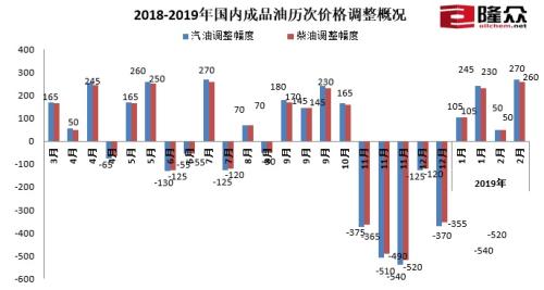2018-2019年國內(nèi)成品油歷次價格調(diào)整概況。來源:隆眾資訊