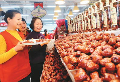 3月18日,北京市商務(wù)局等部門聯(lián)合舉行“北京市消費扶貧產(chǎn)品專區(qū)”暨“和田地區(qū)特色產(chǎn)品專柜”啟動儀式,通過深入開展消費扶貧,著力拓寬受援地區(qū)農(nóng)產(chǎn)品銷售渠道,帶動貧困人口增收脫貧。預(yù)計年內(nèi)開設(shè)扶貧產(chǎn)品專柜的門店將達(dá)到100家。圖為消費者在北京石景山區(qū)一家超市“扶貧產(chǎn)品專區(qū)”選購和田大棗。本報記者 賀勇攝