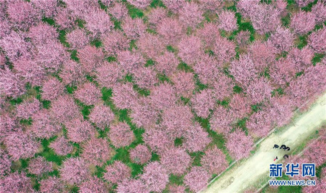 3月19日,游人在陜西勉縣新街子鎮(zhèn)觀賞美人梅(無人機拍攝)。近日,陜西省漢中市勉縣新街子鎮(zhèn)數(shù)十畝美人梅開放,吸引游人前來踏春賞花。 新華社記者 劉瀟 攝