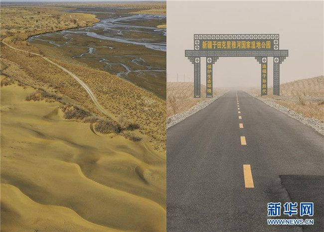 拼版照片:左圖為沿著克里雅河通向地處沙漠深處新疆于田縣達里雅布依鄉(xiāng)的路(3月19日無人機拍攝);右圖為從縣城通往達里雅布依小鎮(zhèn)易地扶貧安置點的柏油路(3月20日攝)。新華社記者 胡虎虎 攝