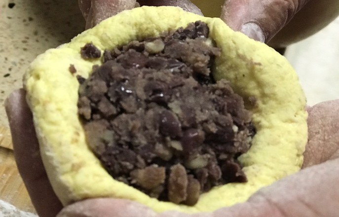 8.取一份揉圓按扁包入餡料。