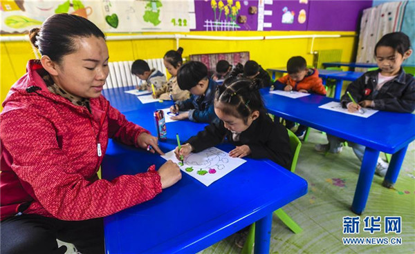 4月21日,在河北省饒陽縣小哈佛幼兒園開展的“愛護(hù)地球 從我做起”主題活動中,老師指導(dǎo)學(xué)生手繪愛護(hù)地球環(huán)境繪畫作品。