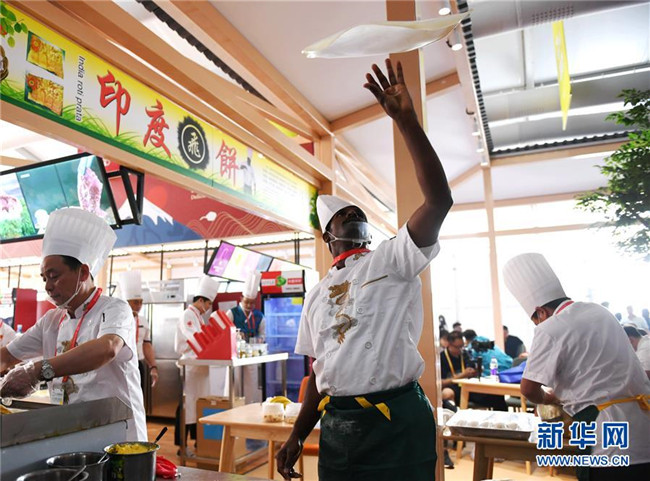 5月16日,在北京奧林匹克公園,廚師在制作印度飛餅。 新華社記者 張晨霖 攝