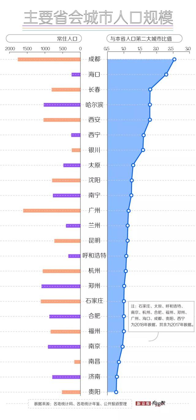 我們可以分三個(gè)區(qū)間來(lái)看下方數(shù)據(jù)圖中標(biāo)示的“與本省人口第二大城市比值”:比值大于 1 說(shuō)明該省會(huì)的人口規(guī)模全省第一,比值等于 1 說(shuō)明該省會(huì)是全省人口第二大城市,比值小于 1 說(shuō)明該省會(huì)的人口規(guī)模要排在全省第三甚至更后。