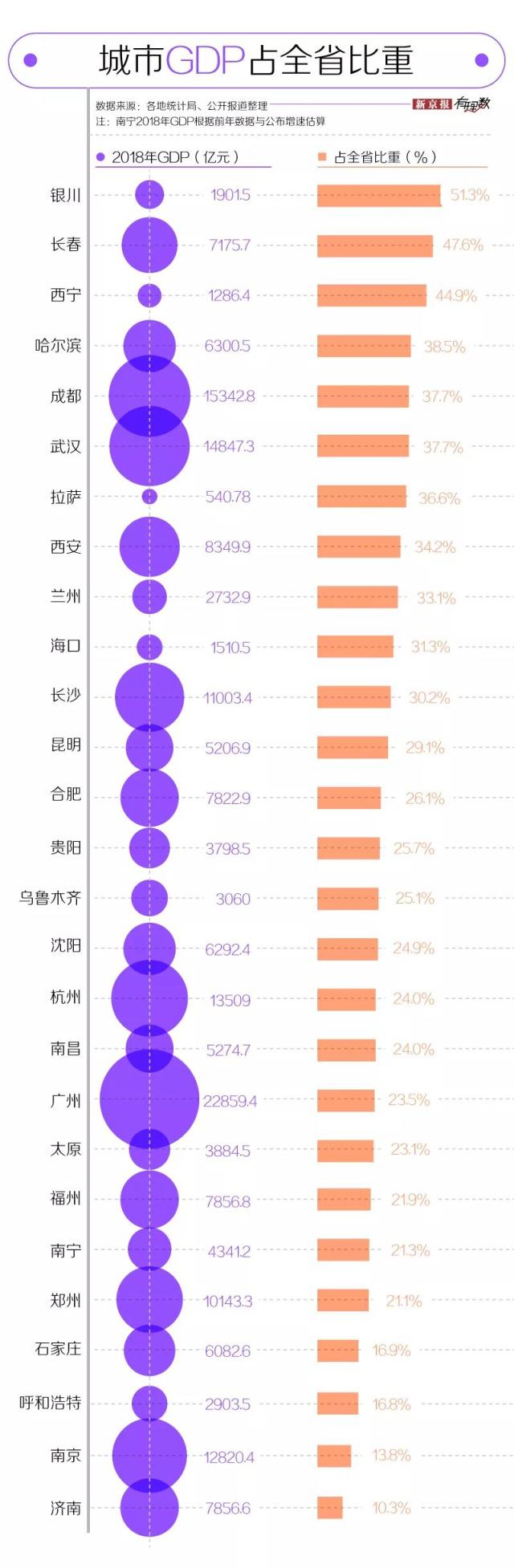 我們梳理了 27 個(gè)省和自治區(qū) 2018 年的地區(qū)生產(chǎn)總值后發(fā)現(xiàn),目前西藏、青海、寧夏、海南、甘肅五地 GDP 未破萬(wàn)億,所以相應(yīng)的拉薩、西寧、銀川、???、蘭州留給大家的記憶點(diǎn)可能不多;而像江蘇、山東兩地 GDP 可以排在全國(guó)前十,但其省會(huì)城市南京、濟(jì)南的 GDP 占全省比重不到 15%。