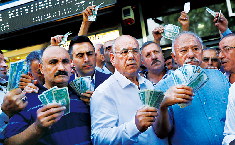 2018年,由于美聯(lián)儲(chǔ)加息導(dǎo)致國(guó)際游資大規(guī)?;亓鳎绹?guó)對(duì)土耳其、伊朗進(jìn)行制裁以及貿(mào)易保護(hù)主義的影響,俄羅斯、阿根廷、土耳其、南非等不少經(jīng)濟(jì)體貨幣遭遇大幅貶值。圖為2018年8月14日,在土耳其首都安卡拉,人們響應(yīng)政府號(hào)召,手持美元站在貨幣兌換處前,出售手中的美元支持本國(guó)貨幣里拉。 新華社/路透