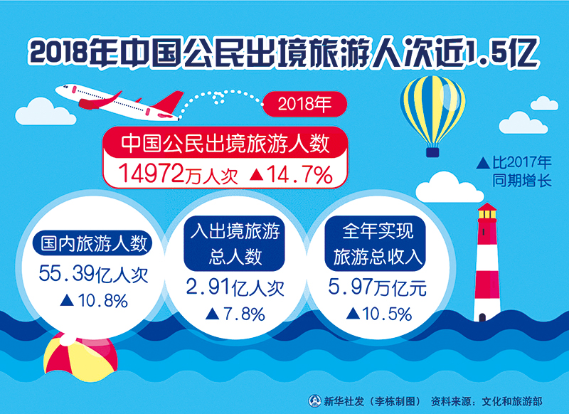近年來,隨著我國(guó)經(jīng)濟(jì)社會(huì)發(fā)展,人民生活水平得到顯著提高,國(guó)民旅游休閑生活更加精彩,出境旅游成為新的時(shí)尚。圖為2018年中國(guó)公民出境旅游相關(guān)數(shù)據(jù)。 新華社發(fā) 李棟/制圖