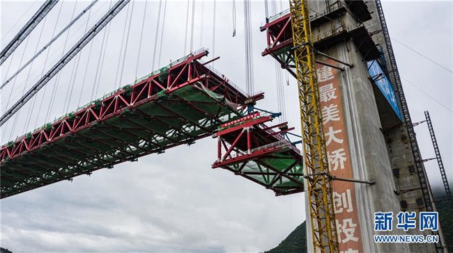 正在拼裝最后一片鋼桁梁的赤水河大橋(5月30日無人機拍攝)。 新華社記者 陶亮 攝