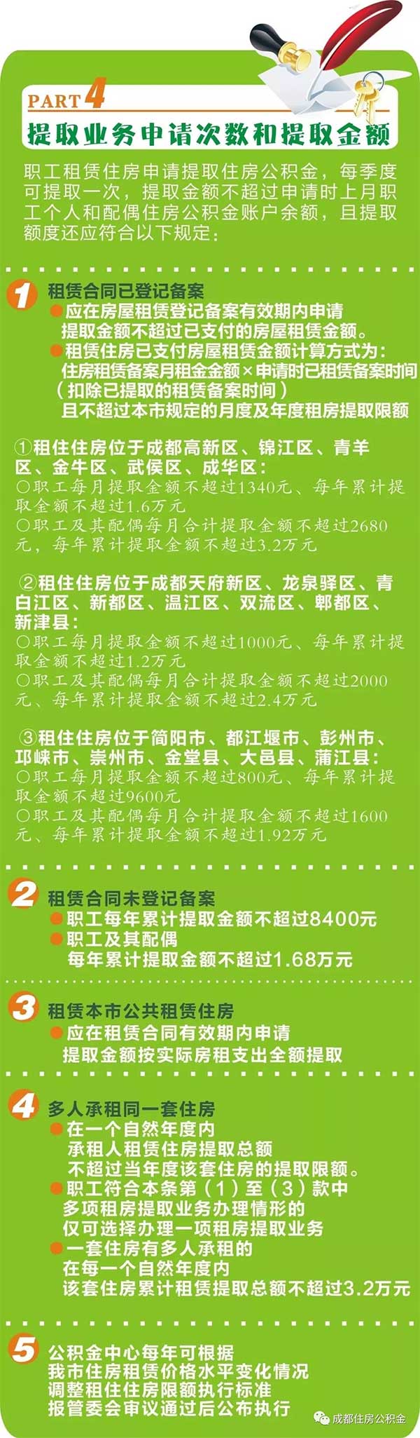 人民網(wǎng)成都6月3日電 (任重)為規(guī)范住房公積金提取管理,貫徹落實(shí)加快建立租購(gòu)并舉住房制度,加大對(duì)市民租賃自住住房支出的政策支持力度,新修訂的《成都住房公積金提取管理辦法》對(duì)租房提取進(jìn)行了優(yōu)化,將于今年9月1日正式實(shí)施。