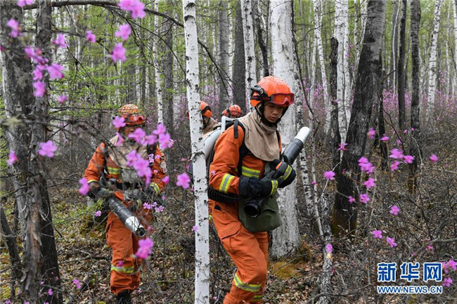 這是內(nèi)蒙古森林消防總隊(duì)大興安嶺支隊(duì)奇乾中隊(duì)的營(yíng)地,營(yíng)地后山上的“忠誠(chéng)”二字是用白樺樹樹干拼接而成(5月15日攝)。新華社記者 劉磊 攝