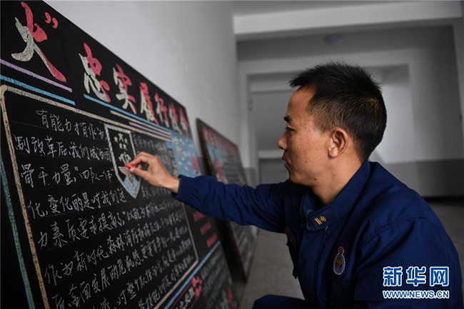 在奇乾中隊(duì)的營(yíng)地,來自四川大涼山的彝族小伙兒布約小兵用粉筆修飾黑板報(bào)(5月18日攝)。新華社記者 劉磊 攝