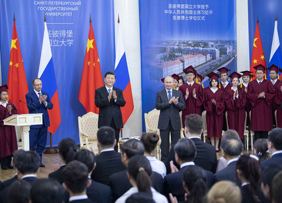 當地時間6月6日,又一場特殊儀式在圣彼得堡國立大學舉行。習近平被授予圣彼得堡國立大學名譽博士學位。他在答辭中說道,這既是雙方教育和人文領域密切交流的例證,更是中俄關系高水平的重要體現。他同時希望雙方不斷擴大教育領域交流合作。