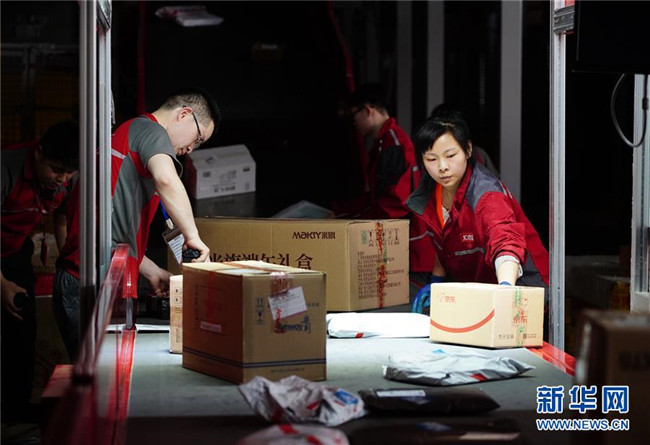 工人在位于西安的京東智能物流中心細(xì)分區(qū)龍門架下整理包裹(6月3日攝)。龍門架掃描后,包裹的出庫物流信息將自動更新。新華社記者 邵瑞 攝