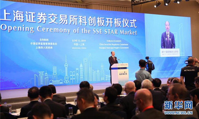 6月13日,上海證券交易所科創(chuàng)板開板儀式在陸家嘴論壇上舉行。這是中國證監(jiān)會主席易會滿在開板儀式上致辭。新華社記者 方喆 攝