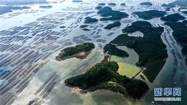 這是無人機拍攝的欽州市以七十二涇海域為中心的連片萬畝大蠔養(yǎng)殖基地(7月20日攝)。 新華社記者 張愛林 攝