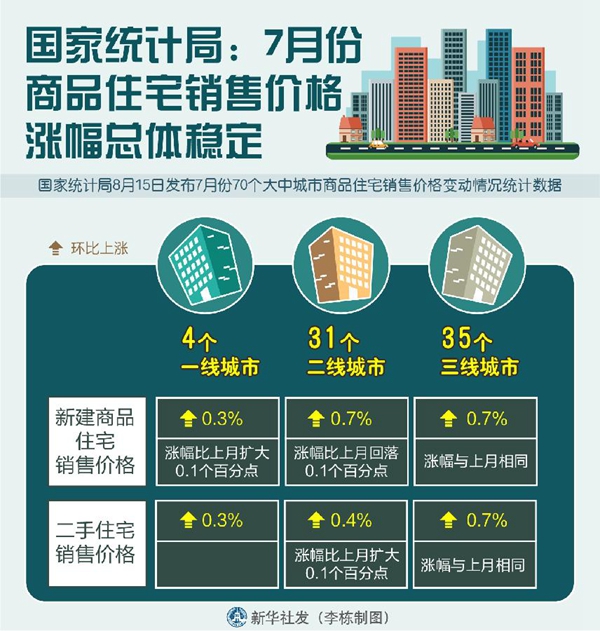 國(guó)家統(tǒng)計(jì)局15日發(fā)布7月份70個(gè)大中城市商品住宅銷(xiāo)售價(jià)格變動(dòng)情況統(tǒng)計(jì)數(shù)據(jù)。統(tǒng)計(jì)顯示,7月份,商品住宅銷(xiāo)售價(jià)格漲幅總體穩(wěn)定。從同比看,一二三線城市新建商品住宅和二手住宅銷(xiāo)售價(jià)格同比漲幅不同程度回落,或與上月相同。