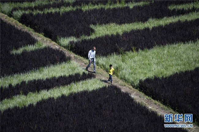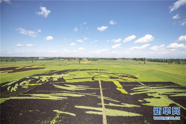 這是8月18日在新疆察布查爾錫伯自治縣納達(dá)齊牛錄鄉(xiāng)稻田畫(huà)基地拍攝的稻田畫(huà)。