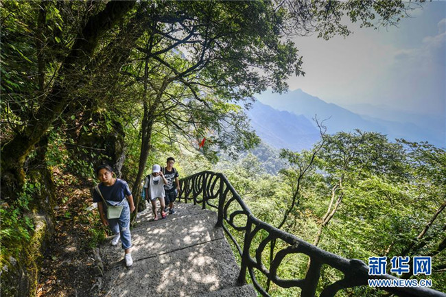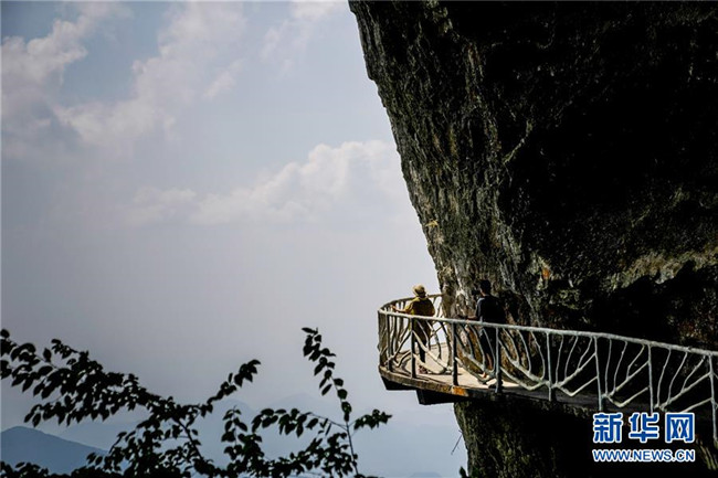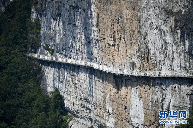 游客在重慶金佛山風(fēng)景區(qū)內(nèi)的絕壁棧道上游覽體驗(8月20日攝)。重慶市南川區(qū)的金佛山風(fēng)景區(qū)屬典型的喀斯特地貌,風(fēng)景秀美,吸引了不少游客。新華社記者劉潺攝