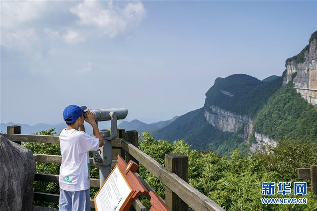 游客在重慶金佛山風(fēng)景區(qū)用望遠鏡觀景(8月20日攝)。重慶市南川區(qū)的金佛山風(fēng)景區(qū)屬典型的喀斯特地貌,風(fēng)景秀美,吸引了不少游客。新華社記者劉潺攝