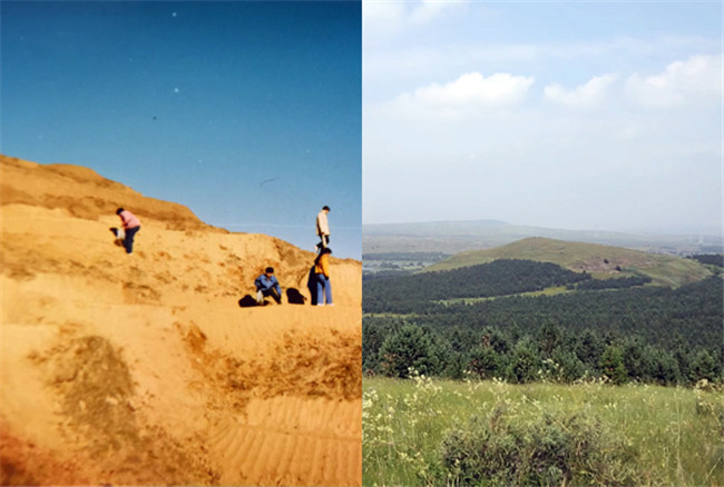 上世紀(jì)80年代的白二爺沙壩“除了黃沙就是黃沙”。如今,這里造林種草保存面積達(dá)12萬畝,植被蓋度提高到75%以上。 左圖:白二爺沙壩治沙站辦公室供圖 右圖:人民網(wǎng)記者 王欲然攝