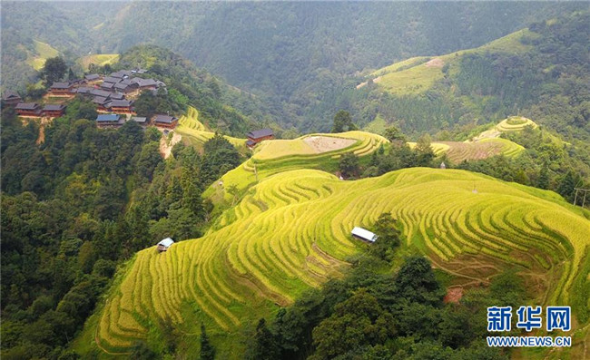 這是9月17日無(wú)人機(jī)拍攝的貴州省榕江縣計(jì)劃鄉(xiāng)計(jì)劃村陽(yáng)開(kāi)苗寨梯田。