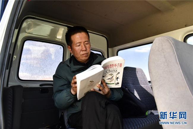 9月25日,青海湖國家級(jí)自然保護(hù)區(qū)管理局的巡湖觀測(cè)人員王延明在巡湖間隙閱讀中國鳥類野外手冊(cè)。