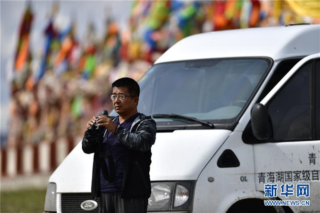 9月24日,青海湖國家級(jí)自然保護(hù)區(qū)管理局的巡湖觀測(cè)人員王延明在青海湖畔進(jìn)行觀測(cè)。