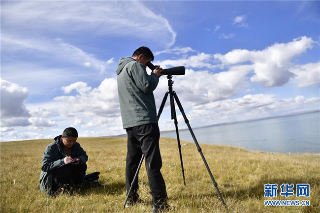 9月23日,青海湖國家級(jí)自然保護(hù)區(qū)管理局的巡湖觀測(cè)人員在青海湖畔進(jìn)行觀測(cè)。