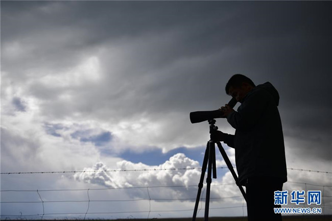 9月23日,青海湖國家級(jí)自然保護(hù)區(qū)管理局的巡湖觀測(cè)人員楊濤在青海湖畔的尕日拉村觀測(cè)點(diǎn)進(jìn)行觀測(cè)。