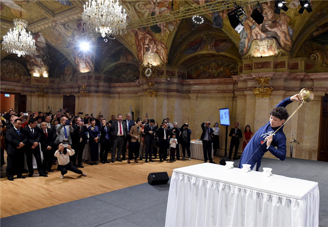 10月9日,在奧地利首都維也納“文化中國(guó)、錦繡四川”四川文化旅游展示會(huì)上,人們觀看茶藝表演。