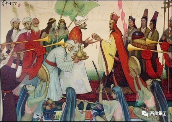 酒除了是國(guó)家祭祀必不可少的重要部分外,也在商業(yè)賦稅和人們情感交流中承擔(dān)著重要地位。陜西西安(古長(zhǎng)安)是古絲綢之路的起點(diǎn),鳳翔是古絲綢之路的重要驛站,西鳳酒自漢代以來就作為饋贈(zèng)友邦、域外交流的國(guó)禮。史書記載,唐儀鳳(公元676年)年間的一個(gè)陽(yáng)春三月,吏部侍郎裴行儉護(hù)送波斯王子泥涅師回國(guó)途中,行至鳳翔縣城以西的亭子頭村附近,發(fā)現(xiàn)柳林鎮(zhèn)窖藏陳酒香氣將五里地外亭子頭的蜜蜂蝴蝶醉倒的奇景,即興吟詩(shī)贊嘆曰:“送客亭子頭,蜂醉蝶不舞;三陽(yáng)開國(guó)泰,美哉柳林酒”,并以此詩(shī)贈(zèng)送王子。